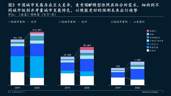 我们对比了三个城市今天与2030年的出行模式分布,发现将有非常大的差异。这些差异一方面来自每个城市目前发展阶段、人口以及出行需求,另一方面也由于很多解决方案供应商、新兴商业模式在满足各个城市需求时的发展进度不太一样。