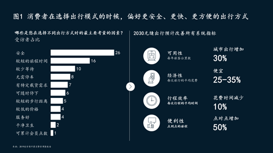 我们询问消费者在选择不同出行方式、不同供应商时的考量因素。在无缝这个关键词下,他们真正在乎的是安全,毕竟出行是从A点到B点,背后有很多考量因素,其中一个关键词即“效率”。无论是较短旅程时间,还是较少等待时间,还是不需要停车,其实质都是如何提升效率,即提升运营效率,一旦运营效率提高经济效益也会随之提升。如果2030年能够实现无缝出行,那么需要在很多指标上体现出来。比如,可用性,城市整体出行的增加,在不增加城市额外负担情况下,解决更多的出行里程;经济性,整个行程效率,包括不断推出的微出行、共享出行,很大程度上也在解决绿色出行、成本节省的问题。