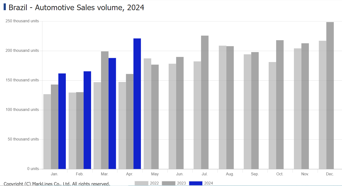 巴西2022至2024年月度汽车销量;图片来源:Marklines