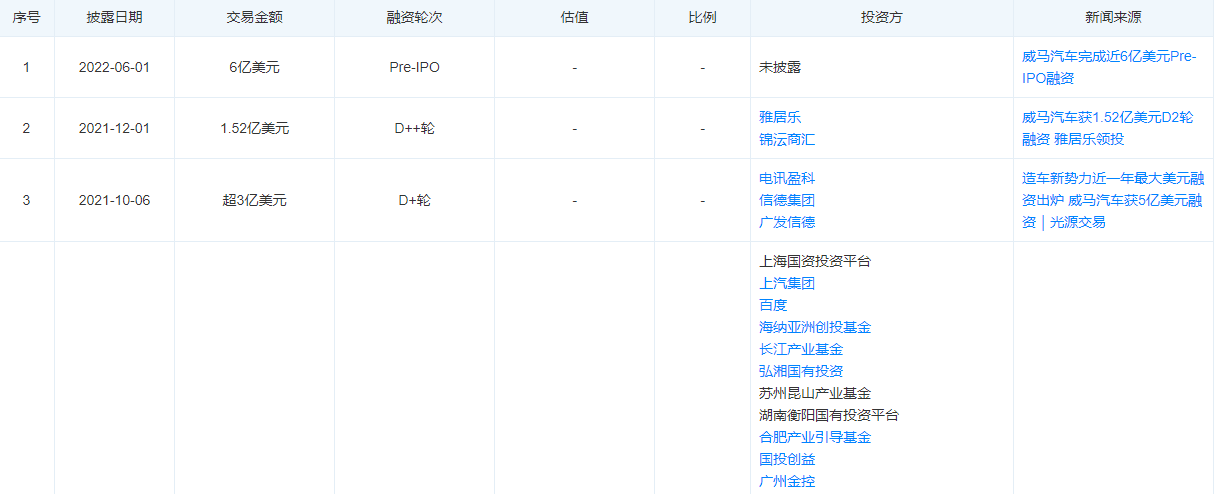 从今年新势力的融资次数以及规模就可窥之一二,但威马仍是资本市场的“宠儿”。天眼查数据显示,威马在今年6月刚获得Pre-IPO融资,金额达6亿美元。或许,这也是沈晖能说出,威马资金链和生产运营正常的“底气”来源。