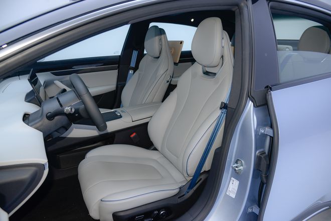 座椅方面,智界S7采用丝云座椅技术,采用一体化的造型和真皮打孔设计。副驾驶则提供了真零重力座椅,随时打造零感悬浮躺姿。