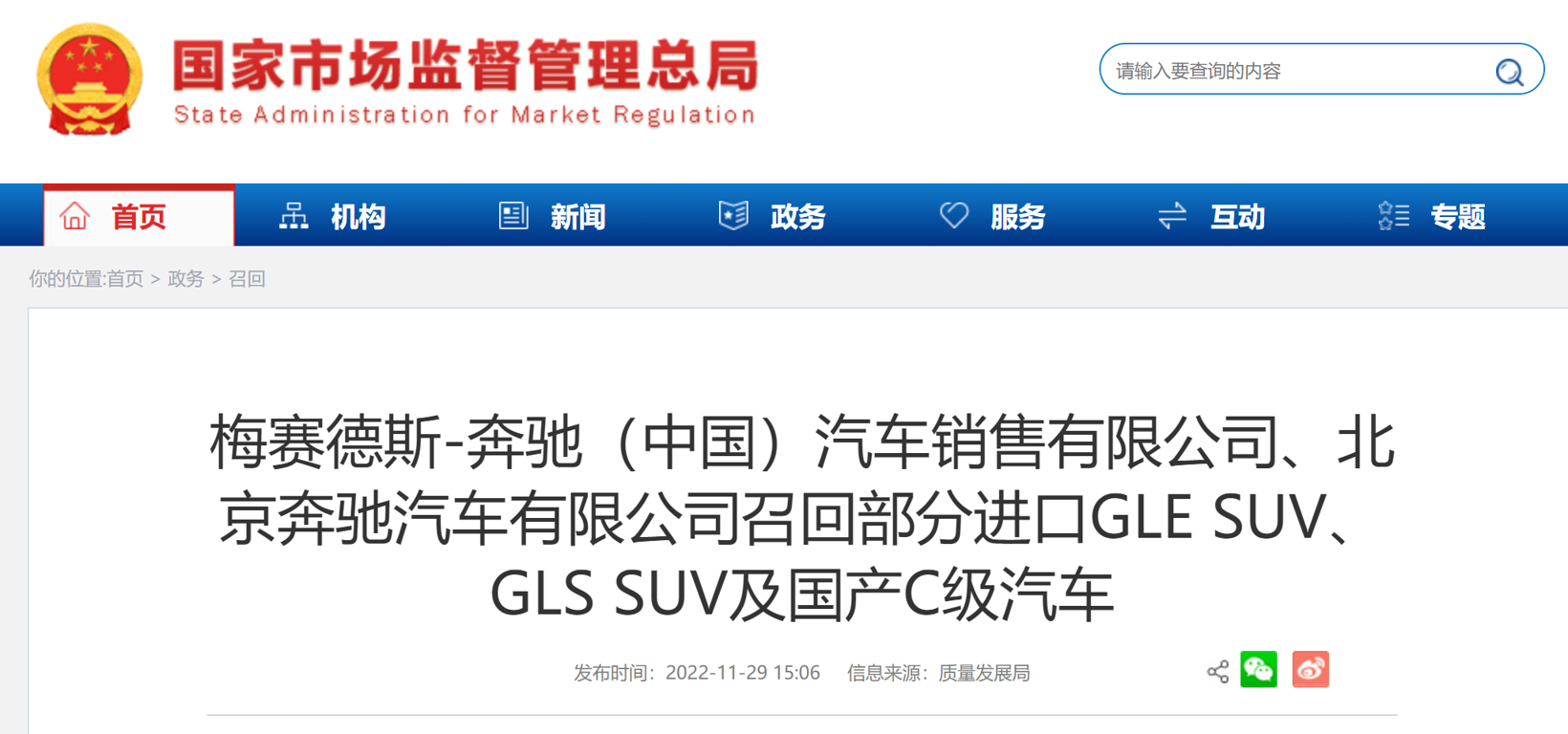 11月29日,梅赛德斯-奔驰(中国)汽车销售有限公司、北京奔驰汽车有限公司根据《缺陷汽车产品召回管理条例》和《缺陷汽车产品召回管理条例实施办法》的要求,向国家市场监督管理总局备案了召回计划,计划召回部分进口GLE SUV、GLS SUV和C级汽车。