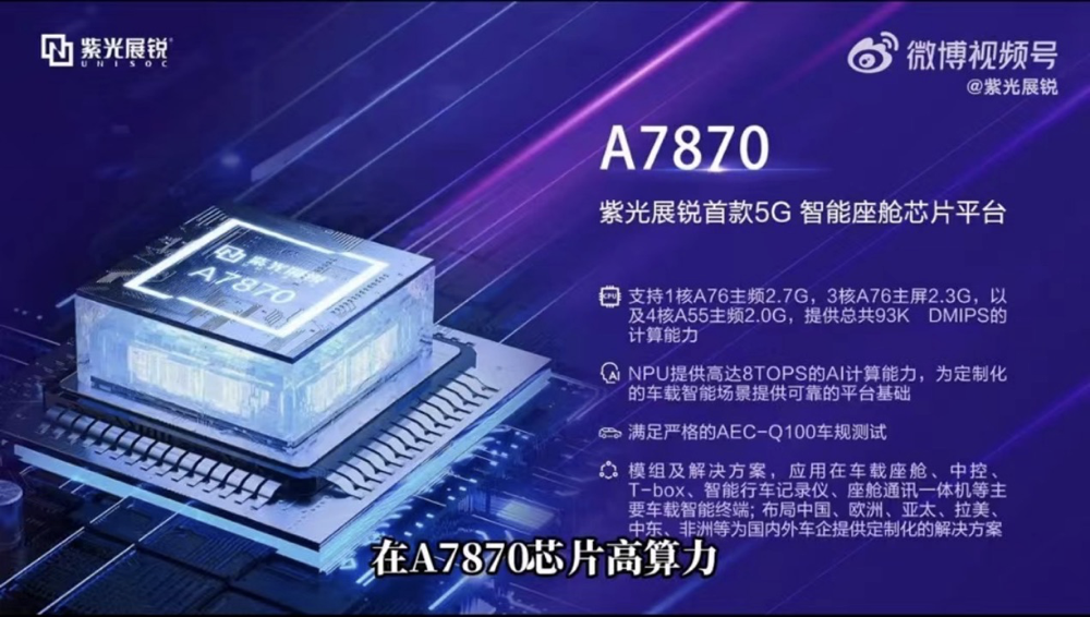 4月11日,紫光展锐官方揭秘了旗下首款车规级5G智能座舱芯片平台A7870。据悉,该平台配置车规级6nm先进制程处理器,具有小尺寸、低功耗、高集成度等优势。
