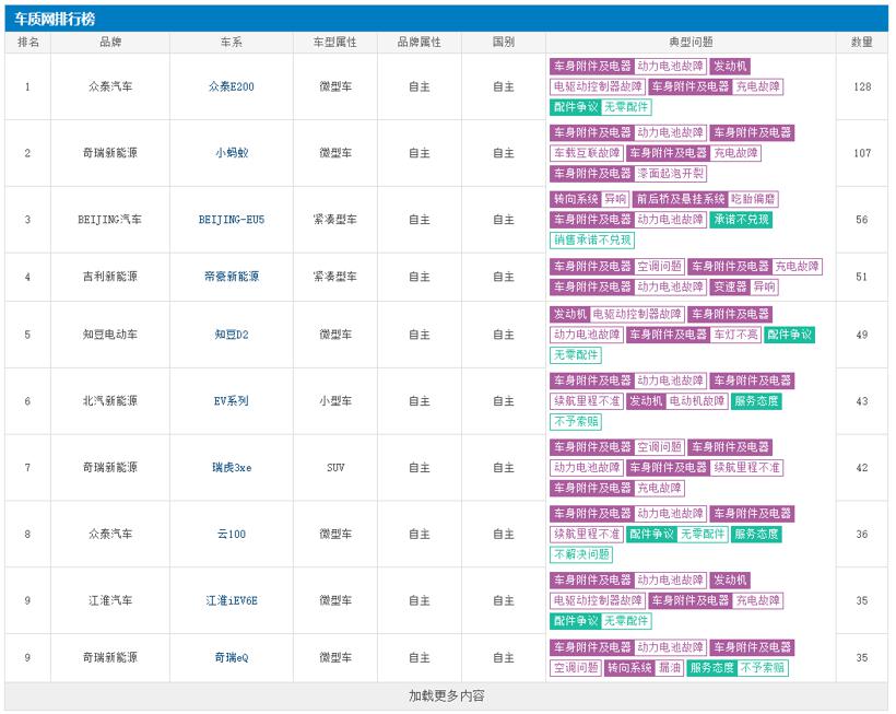 如果拉取近一年的数据,我们能发现,投诉排名靠前的都是些较老的车型,包括众泰家的几款微型车、奇瑞小蚂蚁、北汽EU5等。甚至还有一些不常见的车型,例如瑞虎3xe等。