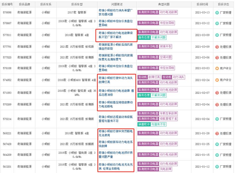 点开这些投诉内容,我们发现不少小蚂蚁用户遇到了动力电池系统故障,很多用户描述在行驶途中会突然失去动力,不能行驶,需停车重新启动车辆方能正常使用。