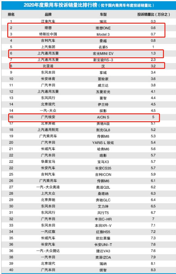 但相反地,新能源车们表现还不错。下图为投诉销量比排行榜,我们将新能源车用红线圈了出来。我认为这张表可能有些小问题,根据多方数据显示,蔚来ES6的成绩为0.7,应该排在第二位。