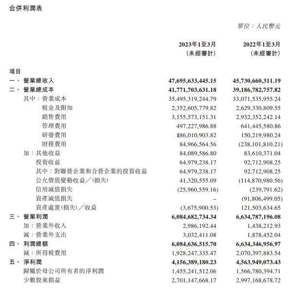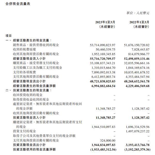 数据显示,北京汽车一季度营收476.96亿元,同比增长4.29%;销售毛利率为25.58%;净利润为41.56亿元,同比下降8.84%,其中归属于母公司所有者的净利润为14.55亿元,同比下降7.09%;经营活动产生的现金流量净额为69.95亿元,同比大幅增长65.41%,主要原因为“支付的各项税费”大幅减少,今年一季度北京汽车支付税费78.90亿元,而去年同期为108.35亿元。