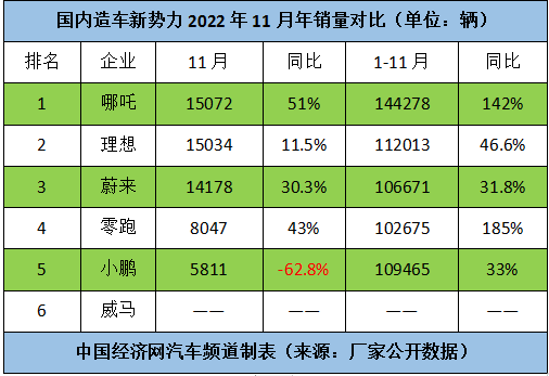 今年前11个月,5家国内造车新势力整齐地跨越了年销10万辆的“生死线”。在汽车业界看来,如果车企跨过了这道坎,意味着将有大概率能够活下去。数据显示,1-11月,哪吒、理想、蔚来、零跑和小鹏的累计销量分别为144278辆、112013辆、106671辆、102675辆、109465辆,同比分别增长142%、46.6%、31.8%、185%、33%。