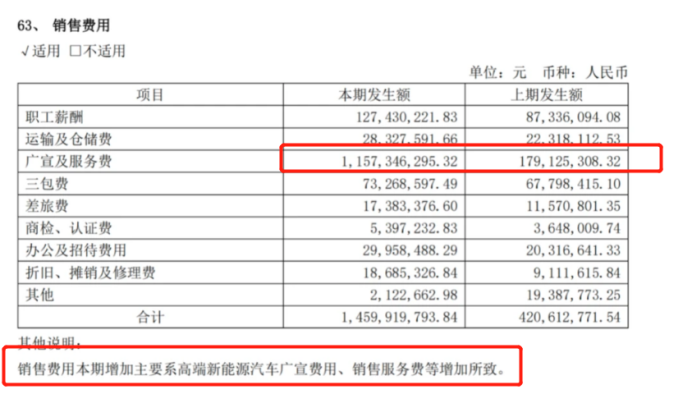 今年上半年,赛力斯的销售费用暴增近10亿元,官方表示其销售费用本期增加主要系高端新能源汽车广宣费用、销售服务费等增加所致。可见华为智选虽然帮助了赛力斯取得销量上的成功,但在盈利方面,反而前途不明。